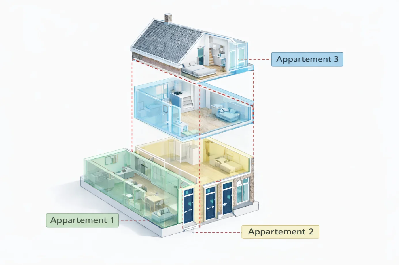 Splitsingstekeningen en bouwkundige onderbouwing voor het juridisch splitsen van een woning.