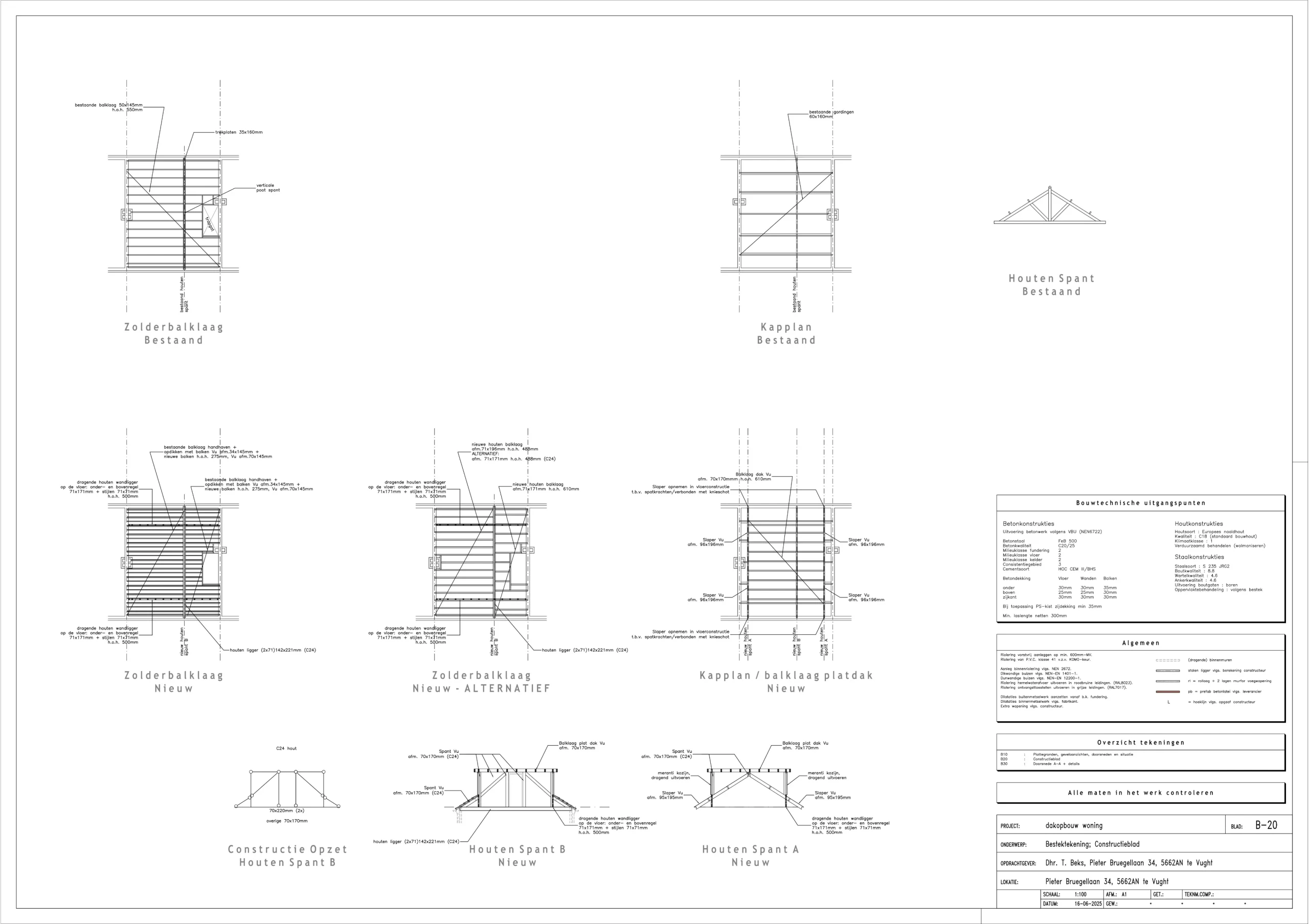 Volledig uitgewerkte bouwtekeningen en constructieve onderbouwing voor een dakopbouw, geschikt voor gemeentelijke toetsing en uitvoering.